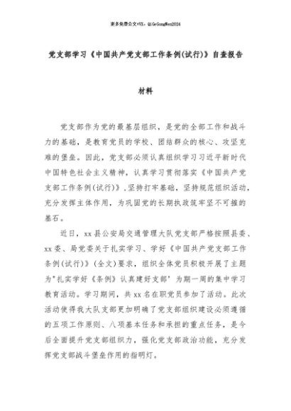 【七哥公文】2024年:党支部学习《中国共产党支部工作条例(试行)》自查报告材料+更多免费公文+VX:QiGeGongWen2024