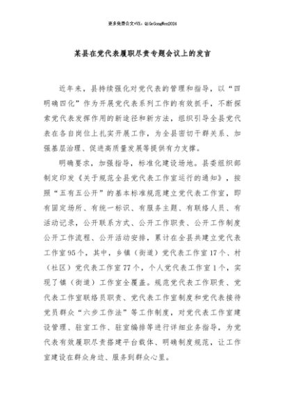 / 【七哥公文】2024年:某县在党代表履职尽责专题会议上的发言+更多免费公文+VX:QiGeGongWen2024