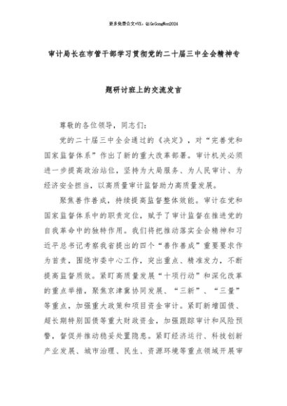 【七哥公文】2024年:审计局长在市管干部学习贯彻党的二十届三中全会精神专题研讨班上的交流发言+更多免费公文+VX:QiGeGongWen2024