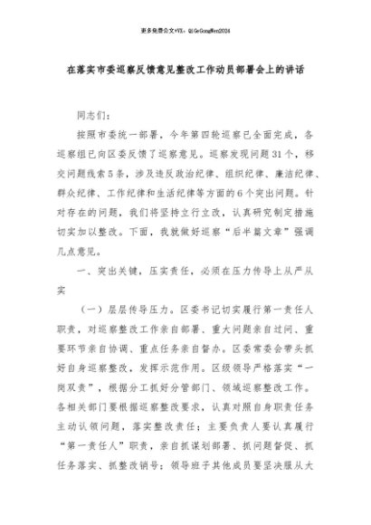 / 【七哥公文】2024年:在落实市委巡察反馈意见整改工作动员部署会上的讲话+更多免费公文+VX:QiGeGongWen2024