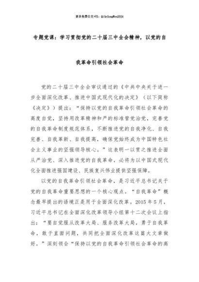 【七哥公文】2024年:专题党课:学习贯彻党的二十届三中全会精神,以党的自我革命引领社会革命+更多免费公文+VX:QiGeGongWen2024