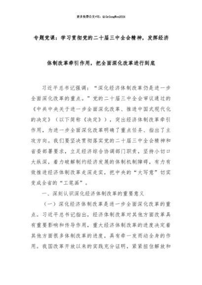 【七哥公文】2024年:专题党课:学习贯彻党的二十届三中全会精神,发挥经济体制改革牵引作用,把全面深化改革进行到底+更多免费公文+VX:QiGeGongWen2024