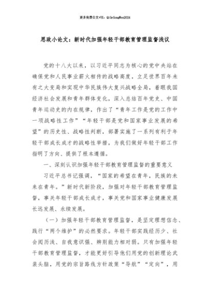 / 【七哥公文】2024年:思政小论文:新时代加强年轻干部教育管理监督浅议+更多免费公文+VX:QiGeGongWen2024