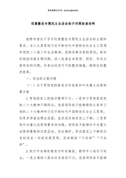 / 【七哥公文】2024年:巡察整改专题民主生活会班子对照检查材料+更多免费公文+VX:QiGeGongWen2024