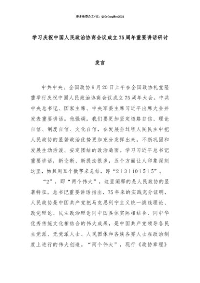 【七哥公文】2024年:学习庆祝中国人民政治协商会议成立75周年重要讲话研讨发言+更多免费公文+VX:QiGeGongWen2024
