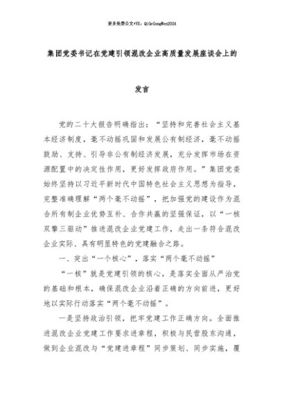 【七哥公文】2024年:集团党委书记在党建引领混改企业高质量发展座谈会上的发言+更多免费公文+VX:QiGeGongWen2024