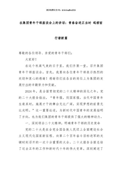 【七哥公文】2024年:在集团青年干部座谈会上的讲话:青春奋进正当时 砥砺前行谱新篇+更多免费公文+VX:QiGeGongWen2024