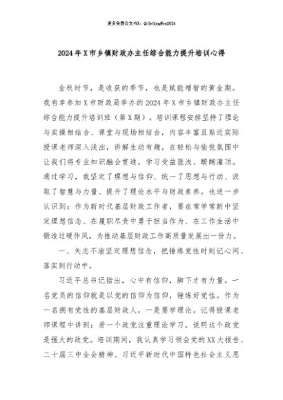 / 【七哥公文】2024年:2024年X市乡镇财政办主任综合能力提升培训心得+更多免费公文+VX:QiGeGongWen2024