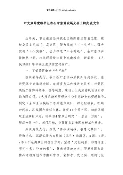 / 【七哥公文】2024年:市文旅局党组书记在全省旅游发展大会上的交流发言+更多免费公文+VX:QiGeGongWen2024