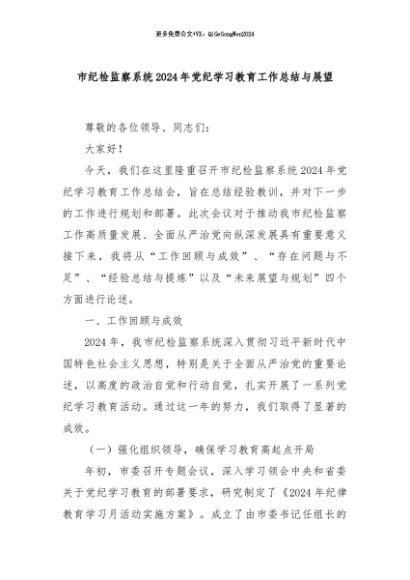 【七哥公文】2024年:市纪检监察系统2024年党纪学习教育工作总结与展望+更多免费公文+VX:QiGeGongWen2024