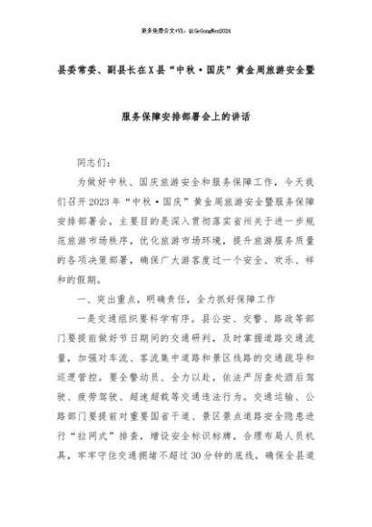 【七哥公文】2024年:县委常委、副县长在X县“中秋·国庆”黄金周旅游安全暨服务保障安排部署会上的讲话+更多免费公文+VX:QiGeGongWen2024