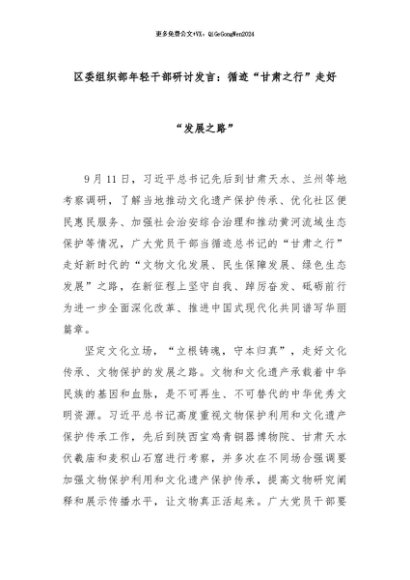 【七哥公文】2024年:区委组织部年轻干部研讨发言:循迹“甘肃之行”走好“发展之路”+更多免费公文+VX:QiGeGongWen2024