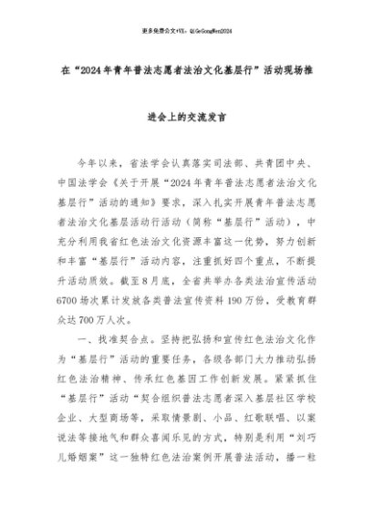 【七哥公文】2024年:在“2024年青年普法志愿者法治文化基层行”活动现场推进会上的交流发言+更多免费公文+VX:QiGeGongWen2024