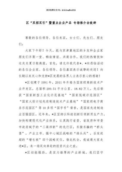 / 【七哥公文】2024年:区“双招双引”暨重点企业产品 专场推介会致辞+更多免费公文+VX:QiGeGongWen2024