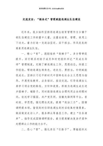/ 【七哥公文】2024年:交流发言:“链条式”管理赋能选调生队伍建设+更多免费公文+VX:QiGeGongWen2024