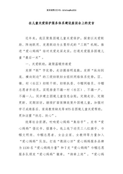 / 【七哥公文】2024年:在儿童关爱保护服务体系建设座谈会上的发言+更多免费公文+VX:QiGeGongWen2024