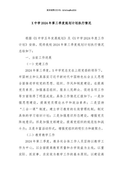 / 【七哥公文】2024年:X中学2024年第三季度规划计划执行情况+更多免费公文+VX:QiGeGongWen2024