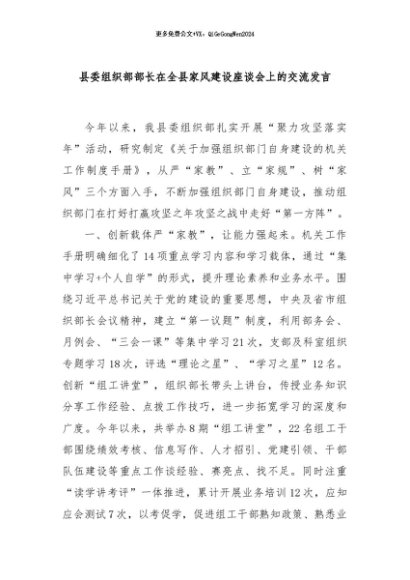 / 【七哥公文】2024年:县委组织部部长在全县家风建设座谈会上的交流发言+更多免费公文+VX:QiGeGongWen2024