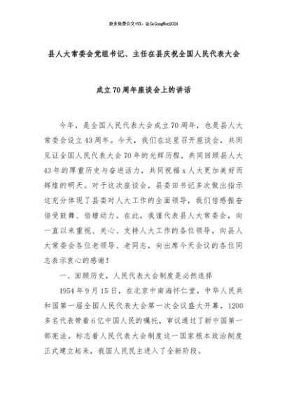 【七哥公文】2024年:县人大常委会党组书记、主任在县庆祝全国人民代表大会成立70周年座谈会上的讲话+更多免费公文+VX:QiGeGongWen2024