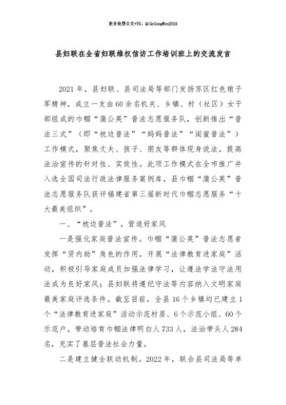 / 【七哥公文】2024年:县妇联在全省妇联维权信访工作培训班上的交流发言+更多免费公文+VX:QiGeGongWen2024