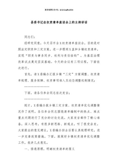 / 【七哥公文】2024年:县委书记在权责清单座谈会上的主持讲话+更多免费公文+VX:QiGeGongWen2024
