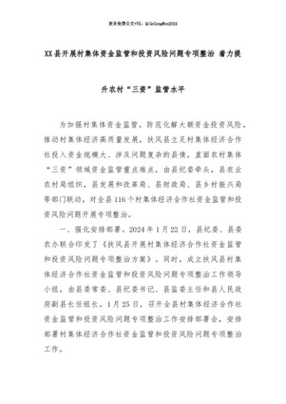 【七哥公文】2024年:XX县开展村集体资金监管和投资风险问题专项整治 着力提升农村“三资”监管水平+更多免费公文+VX:QiGeGongWen2024
