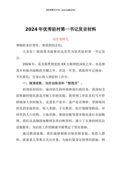 / 【七哥公文】2024年:2024年最新优秀驻村第一书记发言材料+更多免费公文+VX:QiGeGongWen2024