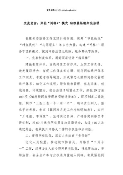 / 【七哥公文】2024年:交流发言:深化“网格+”模式 助推基层精细化治理+更多免费公文+VX:QiGeGongWen2024