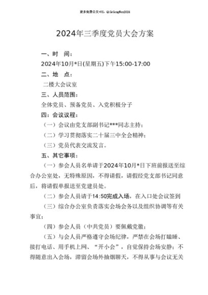 / 【七哥公文】2024年:2024年三季度党员大会方案(10月版)+更多免费公文+VX:QiGeGongWen2024