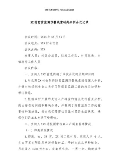 / 【七哥公文】2024年:XX村防贫监测预警线索研判分析会议记录+更多免费公文+VX:QiGeGongWen2024
