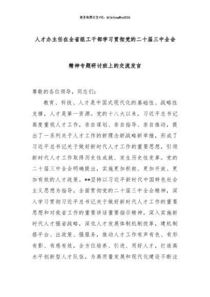 【七哥公文】2024年:人才办主任在全省组工干部学习贯彻党的二十届三中全会精神专题研讨班上的交流发言+更多免费公文+VX:QiGeGongWen2024