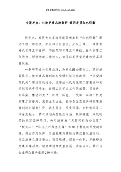 / 【七哥公文】2024年:交流发言:打造党建品牌集群 激活发展红色引擎+更多免费公文+VX:QiGeGongWen2024