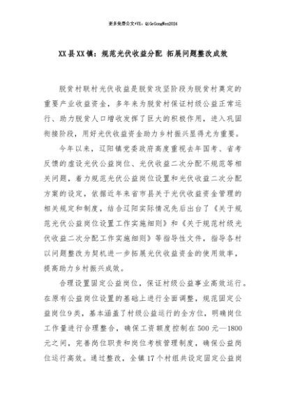 / 【七哥公文】2024年:XX县XX镇:规范光伏收益分配 拓展问题整改成效+更多免费公文+VX:QiGeGongWen2024