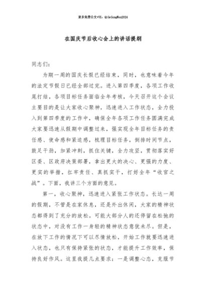 / 【七哥公文】2024年:在国庆节后收心会上的讲话提纲+更多免费公文+VX:QiGeGongWen2024