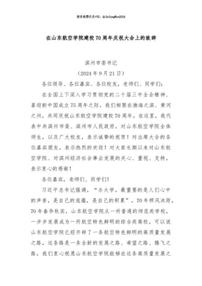 / 【七哥公文】2024年:在山东航空学院建校70周年庆祝大会上的致辞+更多免费公文+VX:QiGeGongWen2024
