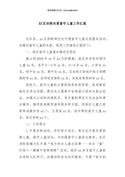/ 【七哥公文】2024年:XX区妇联关爱留守儿童工作汇报+更多免费公文+VX:QiGeGongWen2024