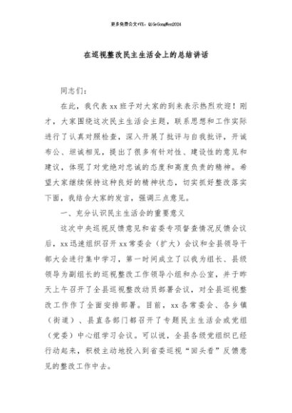 / 【七哥公文】2024年:在巡视整改民主生活会上的总结讲话+更多免费公文+VX:QiGeGongWen2024