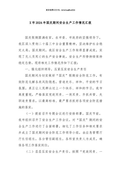 / 【七哥公文】2024年:X市2024年国庆期间安全生产工作情况汇报+更多免费公文+VX:QiGeGongWen2024