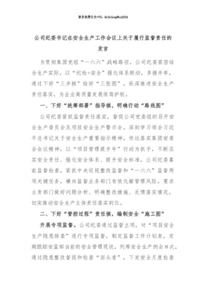 【七哥公文】2024年:公司纪委书记在安全生产工作会议上关于履行监督责任的发言+更多免费公文+VX:QiGeGongWen2024