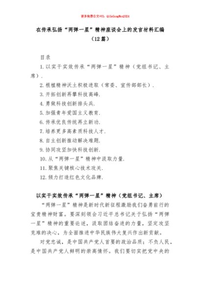 【七哥公文】2024年:(12篇)在传承弘扬“两弹一星”精神座谈会上的发言材料汇编+更多免费公文+VX:QiGeGongWen2024