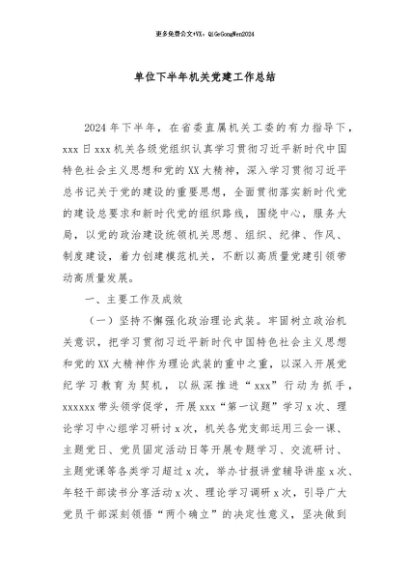 / 【七哥公文】2024年:单位下半年机关党建工作总结+更多免费公文+VX:QiGeGongWen2024