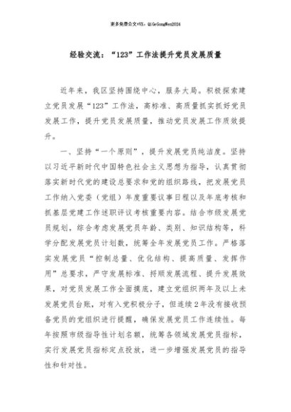 / 【七哥公文】2024年:经验交流:“123”工作法提升党员发展质量+更多免费公文+VX:QiGeGongWen2024
