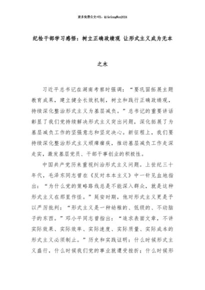 【七哥公文】2024年:纪检干部学习感悟:树立正确政绩观 让形式主义成为无本之木+更多免费公文+VX:QiGeGongWen2024