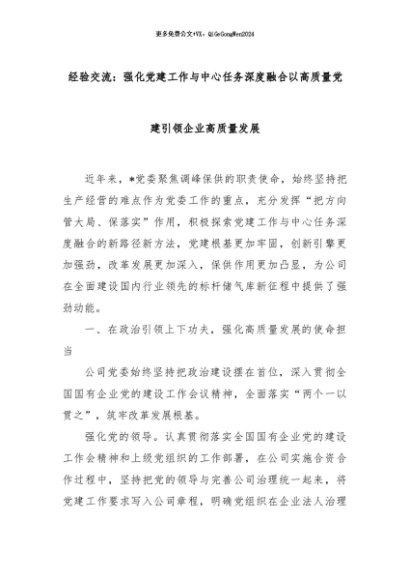 【七哥公文】2024年:经验交流:强化党建工作与中心任务深度融合以高质量党建引领企业高质量发展+更多免费公文+VX:QiGeGongWen2024