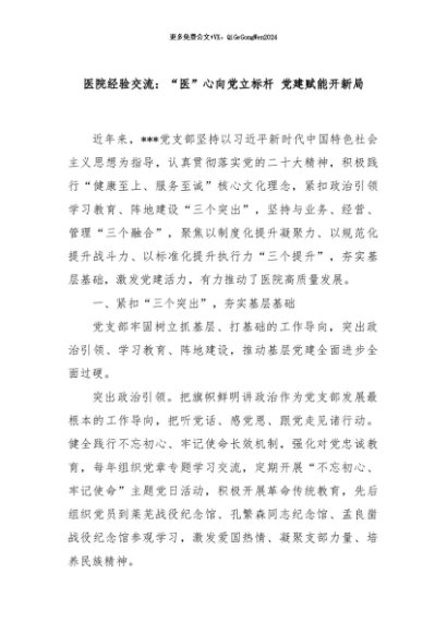 / 【七哥公文】2024年:医院经验交流:“医”心向党立标杆 党建赋能开新局+更多免费公文+VX:QiGeGongWen2024