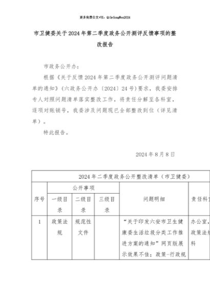 【七哥公文】2024年:市卫健委关于2024年第二季度政务公开测评反馈事项的整改报告清单+更多免费公文+VX:QiGeGongWen2024