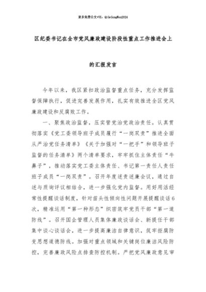 【七哥公文】2024年:区纪委书记在全市党风廉政建设阶段性重点工作推进会上的汇报发言+更多免费公文+VX:QiGeGongWen2024