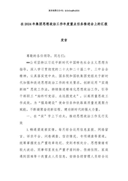 【七哥公文】2024年:在2024年集团思想政治工作年度重点任务推进会上的汇报发言+更多免费公文+VX:QiGeGongWen2024