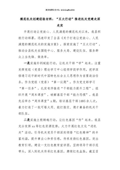 【七哥公文】2024年:模范机关创建经验材料:“五大行动”推进机关党建走深走实+更多免费公文+VX:QiGeGongWen2024