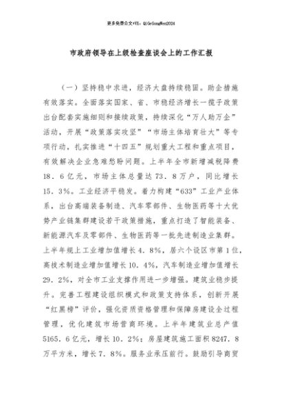 / 【七哥公文】2024年:市政府领导在上级检查座谈会上的工作汇报+更多免费公文+VX:QiGeGongWen2024